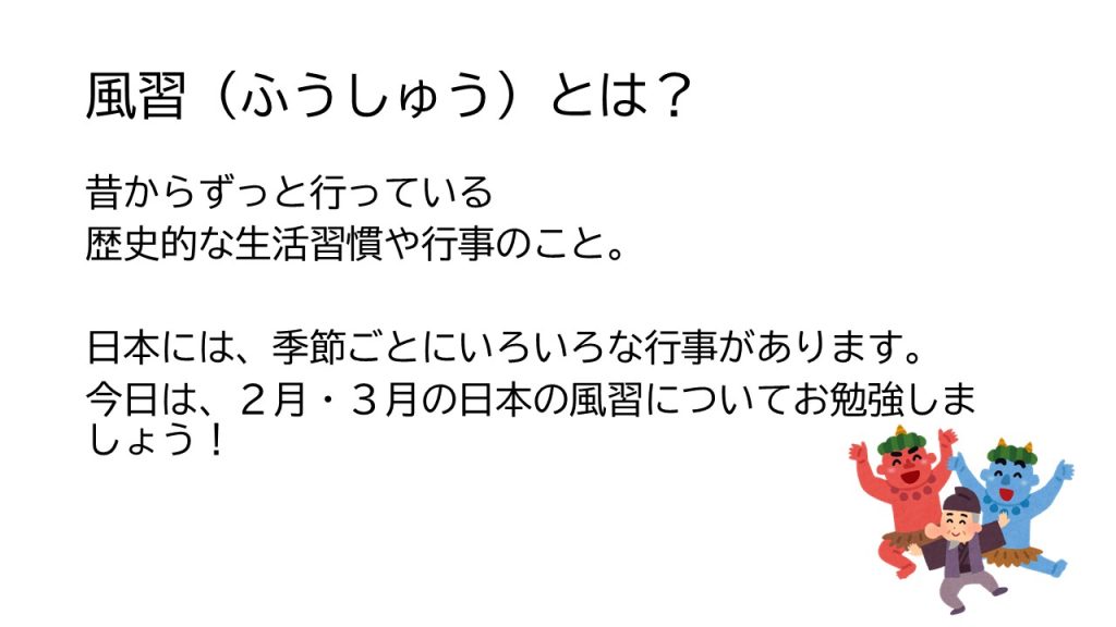 いつもは介護用語勉強会ですが、今回は内容を変えて、日本の風習についての勉強会を実施しました。